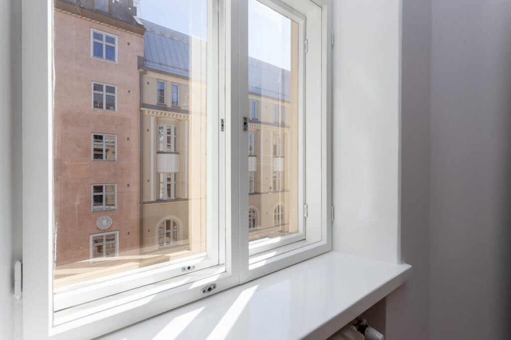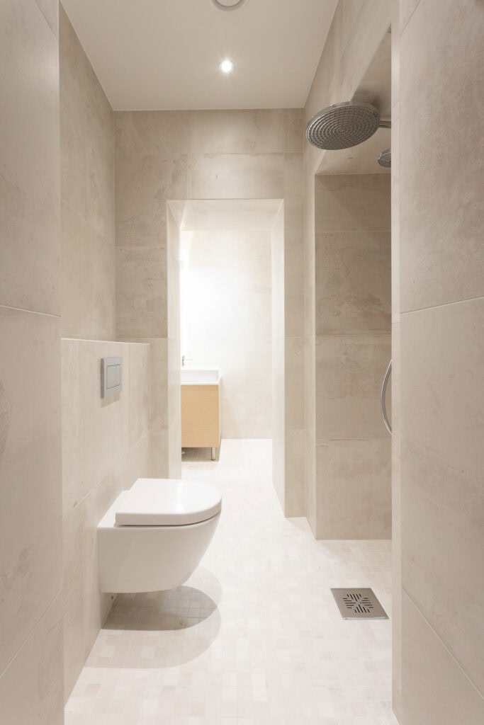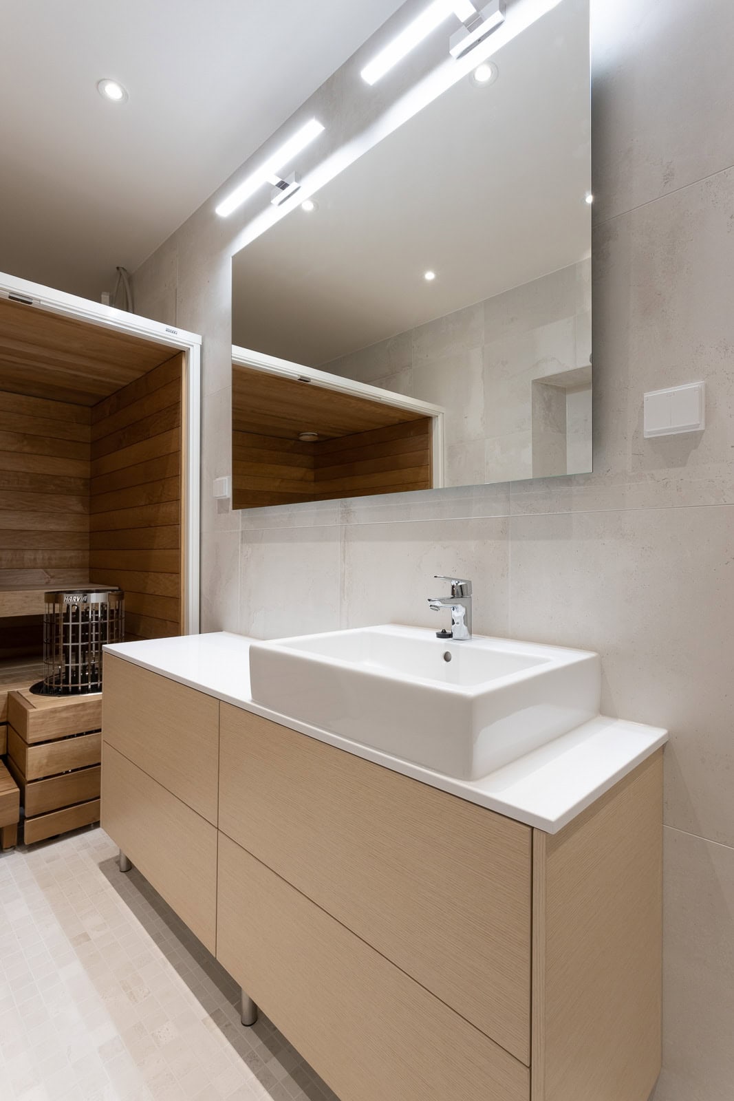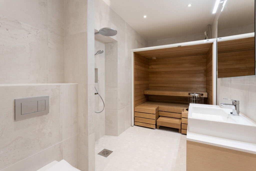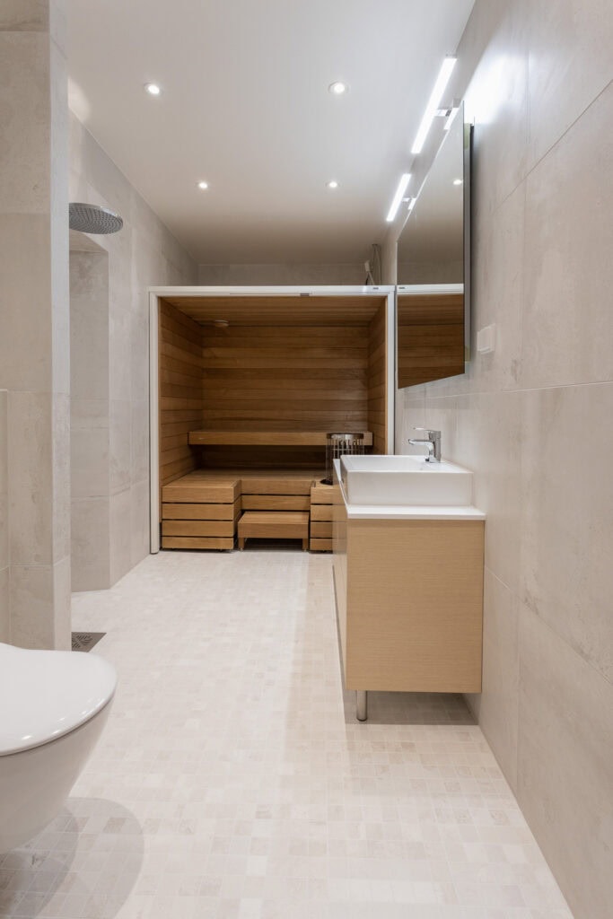 Tässä asunnossa toteutettiin yhteistyössä Harvian kanssa innovatiivinen kylpyhuoneen sisään asennettava moduulisauna. Tämä ratkaisu on erityinen, sillä se ei vaadi erillistä poistoilmakanavointia ja sauna voidaan tuoda jo valmiin kylpyhuoneen sisään.