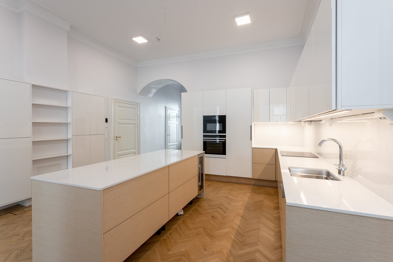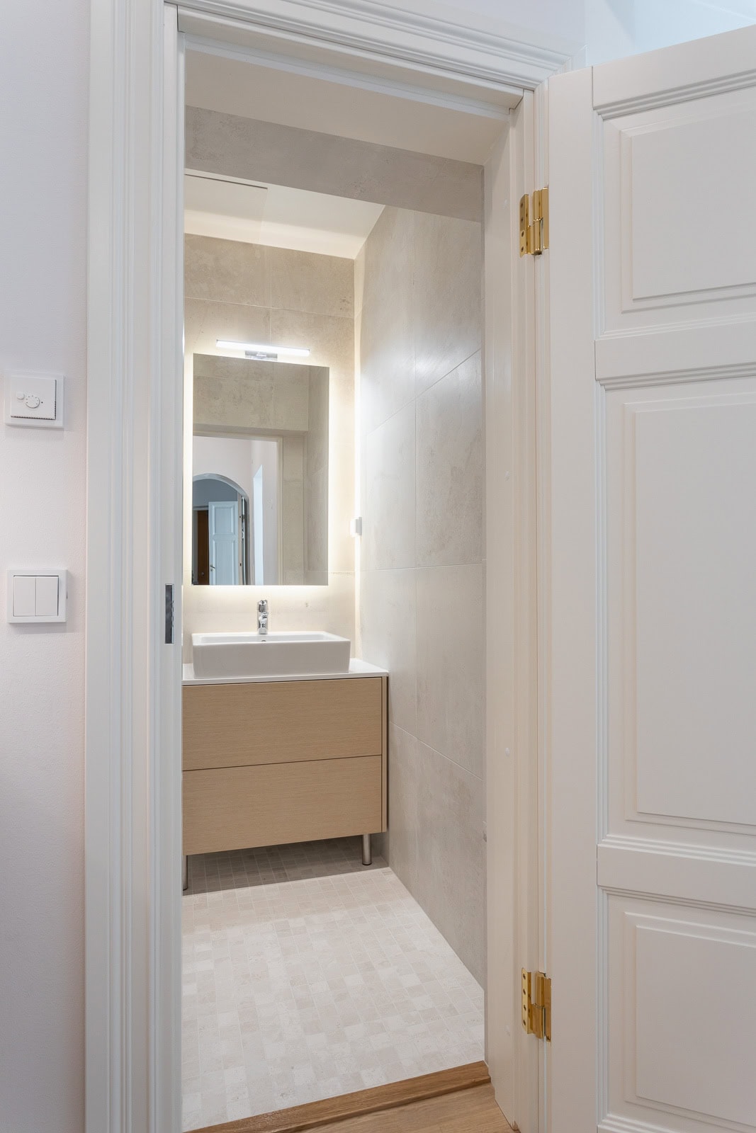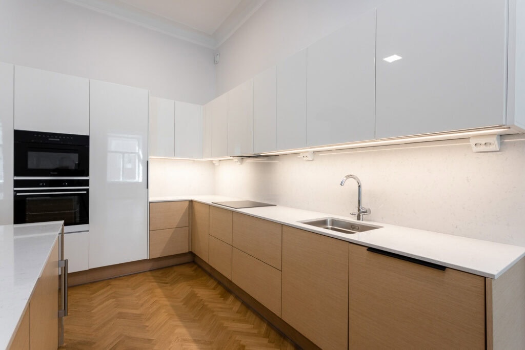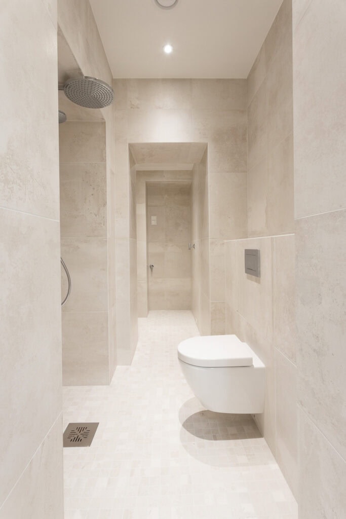 Tässä asunnossa toteutettiin yhteistyössä Harvian kanssa innovatiivinen kylpyhuoneen sisään asennettava moduulisauna. Tämä ratkaisu on erityinen, sillä se ei vaadi erillistä poistoilmakanavointia ja sauna voidaan tuoda jo valmiin kylpyhuoneen sisään.